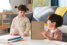 图片标题: 房间里一位亚洲华裔母亲陪伴两个孩子坐在地板上玩耍