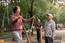 图片标题: 公园里使用锻炼器材锻炼的老年夫妇
