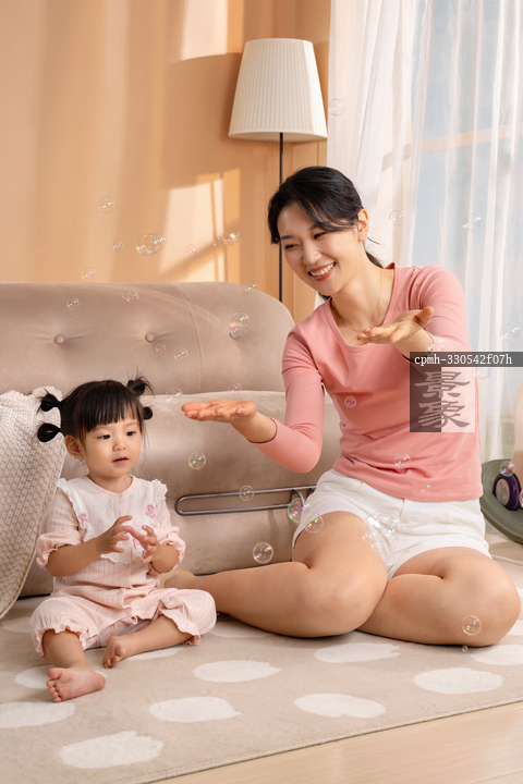图片标题: 一名亚洲华裔青年母亲陪伴女儿在房间里玩耍