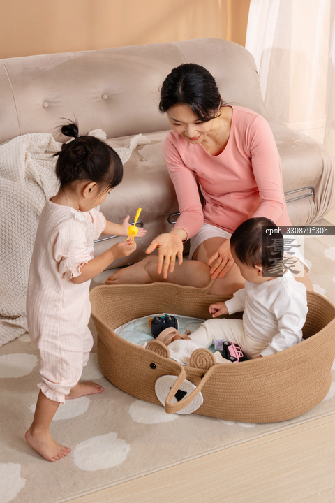 图片标题: 房间里一位年轻妈妈陪两位宝宝玩耍