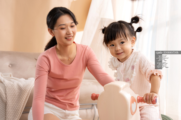 图片标题: 一名亚洲华裔青年母亲陪伴女儿骑着玩具木马玩耍