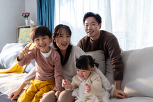 图片标题: 快乐的一家四口在房间里,年轻父亲陪伴孩子玩玩具。