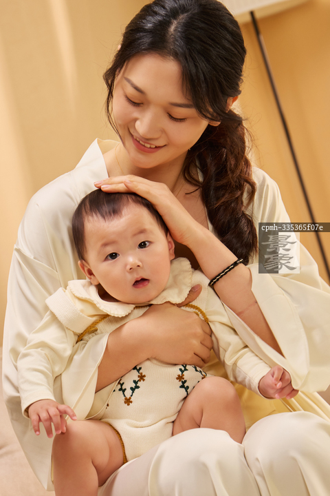 图片标题: 一位年轻妈妈坐在客厅的沙发上抱着宝宝玩耍