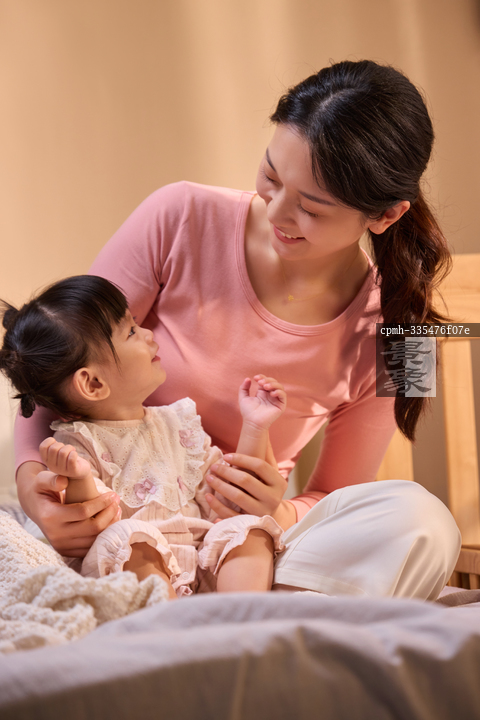 图片标题: 房间里年轻妈妈陪伴女儿在床上玩耍