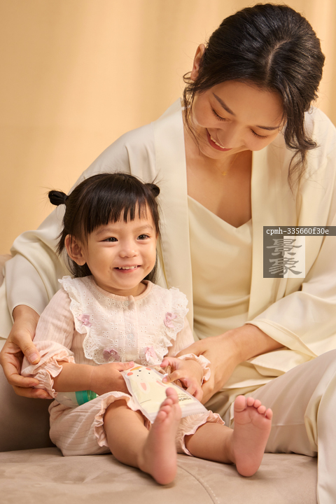 图片标题: 一位年轻妈妈坐在客厅的沙发上陪着女儿玩耍