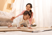 图片标题: 一位年轻妈妈坐在客厅的沙发上抱着宝宝玩耍