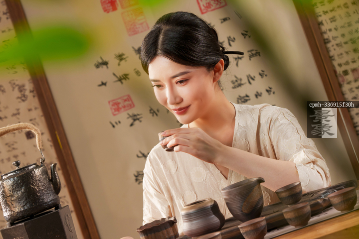 图片标题:     茶室里一位中国古典女人喝茶