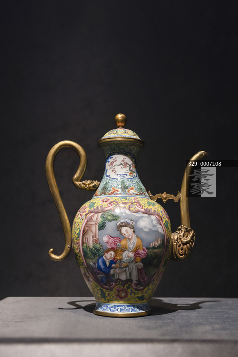 图片标题: 故宫-紫禁城与凡尔赛宫-17、18世纪的中法交往-乾隆款画珐琅缠枝花卉开光西洋仕女图持壶-清乾隆-故宫博物院藏