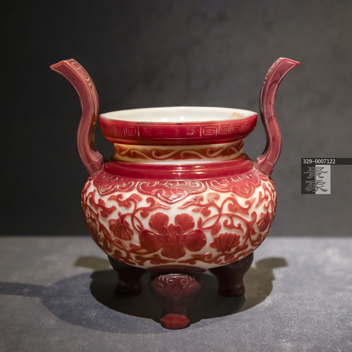 图片标题: 故宫-紫禁城与凡尔赛宫-17、18世纪的中法交往-乾隆款白套红玻璃缠枝花纹鼎式炉-清乾隆-清宫造办处-故宫博物院藏