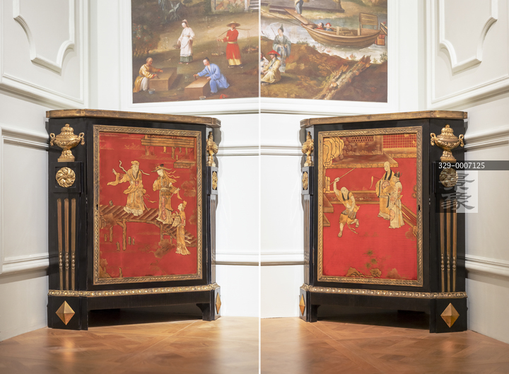 图片标题: 故宫-紫禁城与凡尔赛宫-17、18世纪的中法交往-橡木嵌朱漆描金人物图墙角柜-1765年-凡尔赛宫与特里亚农宫国家博物馆藏