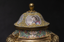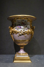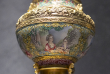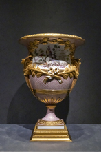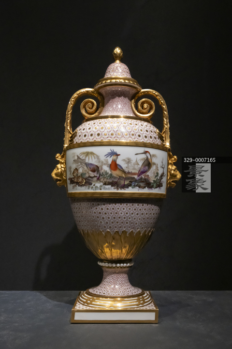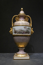 图片标题: 故宫-紫禁城与凡尔赛宫-17、18世纪的中法交往-淡紫金点地彩绘描金嵌开光花鸟风景图镀金卷耳狮首瓷瓶-1780年-法国塞弗尔瓷器工场-凡尔赛宫与特里亚农宫国家博物馆藏