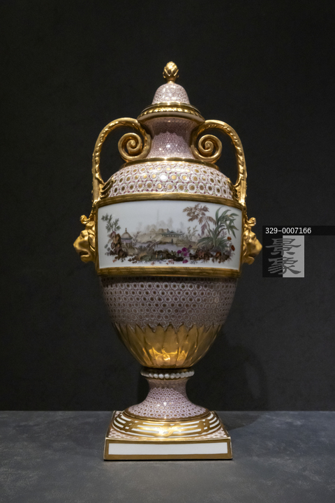 图片标题:     故宫-紫禁城与凡尔赛宫-17、18世纪的中法交往-淡紫金点地彩绘描金嵌开光花鸟风景图镀金卷耳狮首瓷瓶-1780年-法国塞弗尔瓷器工场-凡尔赛宫与特里亚农宫国家博物馆藏