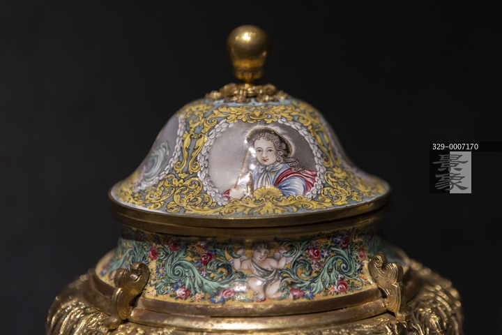 图片标题: 故宫-紫禁城与凡尔赛宫-17、18世纪的中法交往-乾隆款画珐琅西洋人物图盖罐(局部)清乾隆-故宫博物院藏