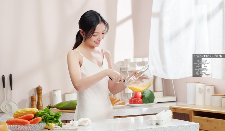 图片标题: 一位亚洲华裔青年女人在厨房里打鸡蛋做早餐