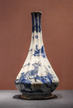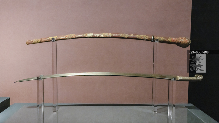 图片标题: 北京故宫-历史之遇-中国与西亚古代文明交流展-银嵌宝石柄皮鞘特坎腰刀-清代-故宫博物院藏