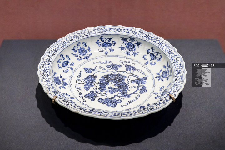 图片标题: 北京故宫-历史之遇-中国与西亚古代文明交流展-青花折枝葡萄纹菱花口折沿盘-15世纪-伊朗国家博物馆藏
