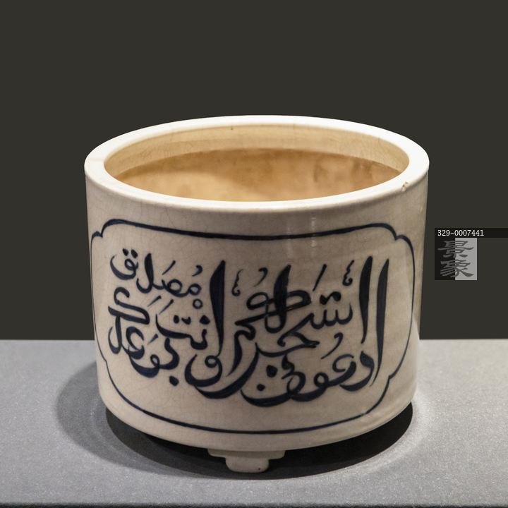 图片标题: 北京故宫-历史之遇-中国与西亚古代文明交流展-青花开光阿拉伯文三足炉-清康熙-故宫博物院藏