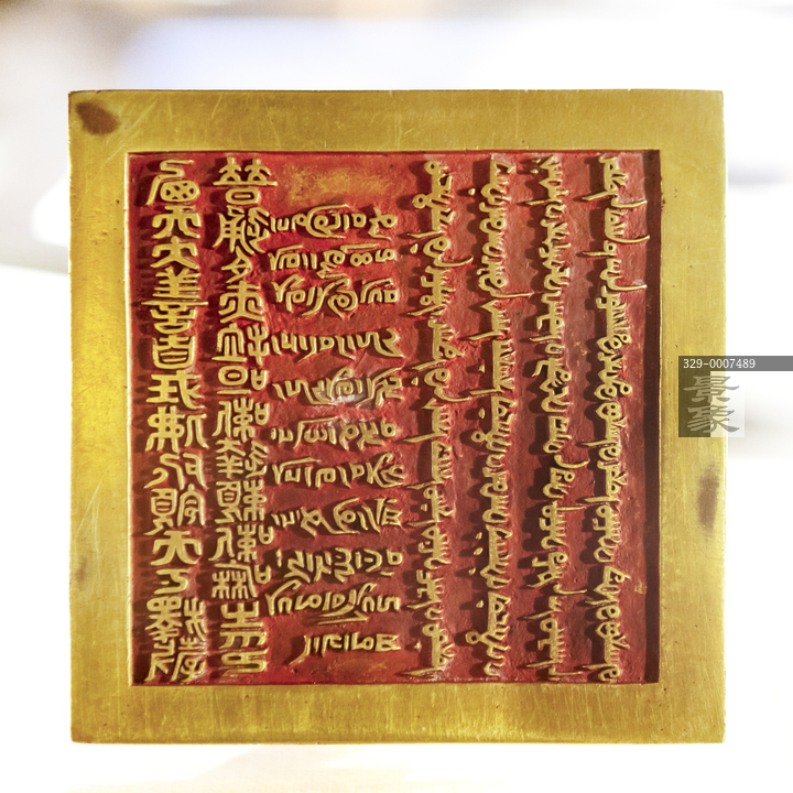 图片标题: 北京民族文化宫-文物古籍展-西天大善自在佛所领天下释教普通瓦赤拉喇达赖喇嘛之印(复制件)-清代-金质-汉文-藏文-满文-蒙古文-民族文化馆藏