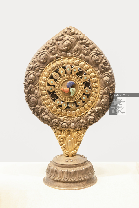 图片标题:     北京民族文化宫-文物古籍展-银鎏金錾花嵌宝石法轮-清代-民族文化宫藏