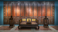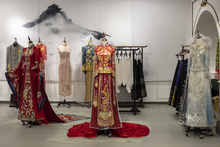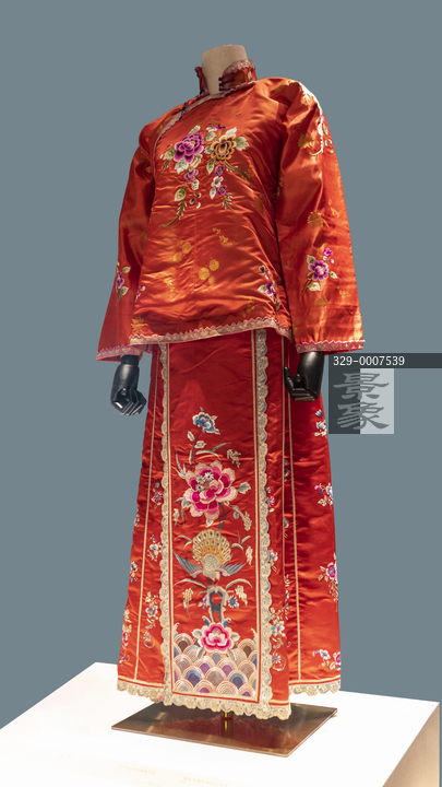 图片标题: 北京展览馆-千里姻缘-中华传统婚庆文化展-朱红平绣孔雀纹马面裙-清代-北京民俗博物馆藏