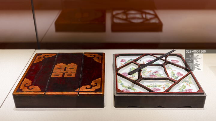 图片标题:     北京展览馆-千里姻缘-中华传统婚庆文化展-白瓷粉彩喜字九联碟及喜字木盒-清代-北京民俗博物馆藏