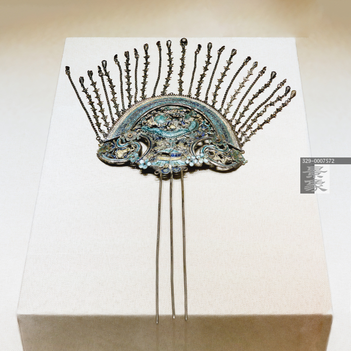 图片标题: 北京展览馆-千里姻缘-中华传统婚庆文化展-珐琅彩团龙纹扇形银步摇发钗-清代-北京民俗博物馆藏