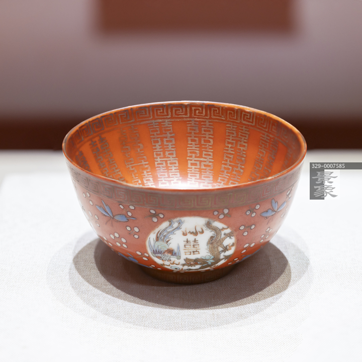 图片标题:     北京展览馆-千里姻缘-中华传统婚庆文化展-长春同庆款珊瑚釉喜字碗-清代-天津博物馆藏