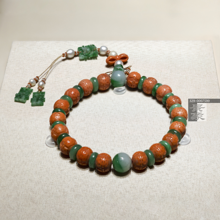 图片标题: 北京展览馆-千里姻缘-中华传统婚庆文化展-珊瑚雕双喜十八子手串-清代-故宫博物院藏