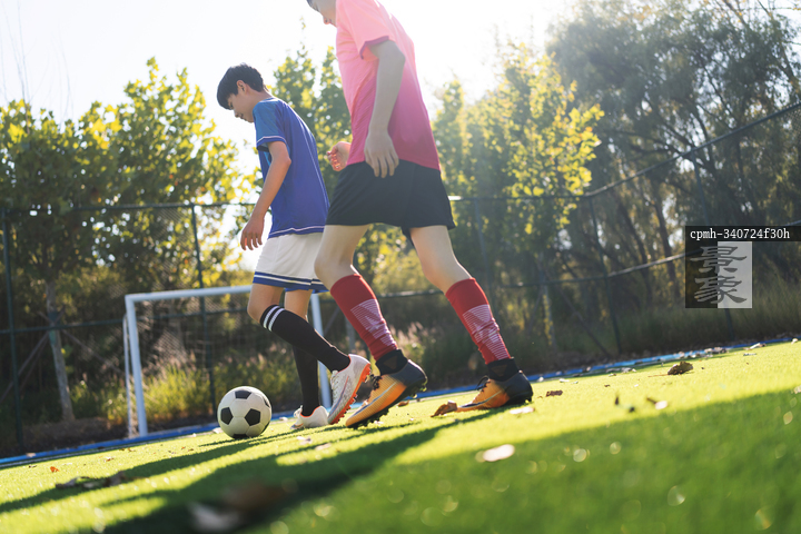图片标题: 绿茵场上踢球的青少年男孩