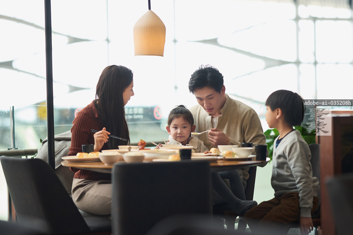 图片标题:     机场餐厅用餐的一家四口