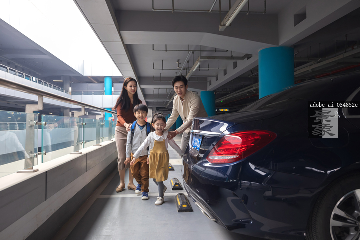 图片标题: 机场停车楼的一家四口