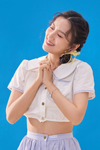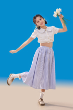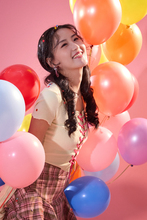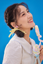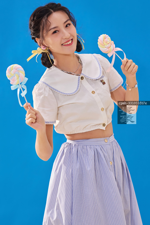 图片标题: 蓝色背景下的拿着棒棒糖的快乐女人