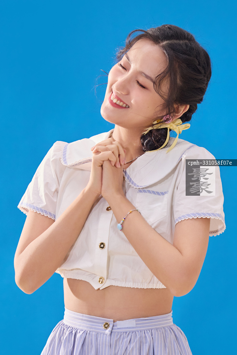 图片标题: 蓝色背景下的一位快乐的青年女人