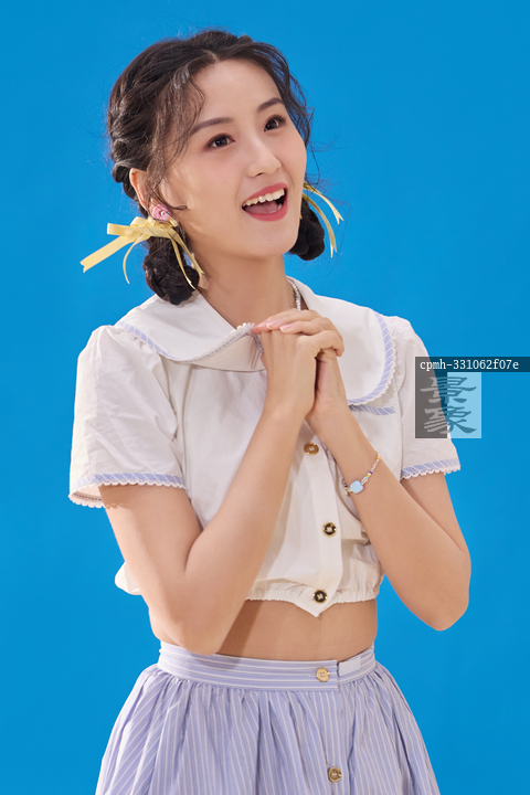 图片标题:     蓝色背景下的一位快乐的青年女人