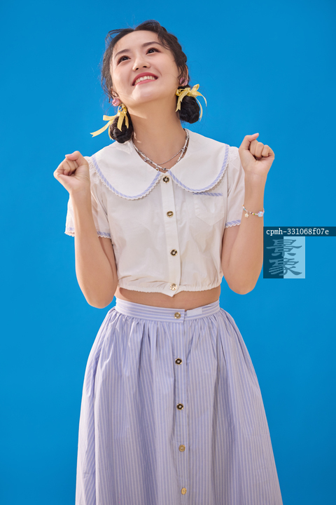 图片标题:     蓝色背景下的一位快乐的青年女人