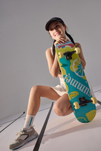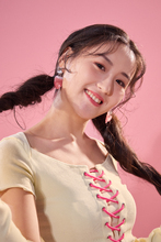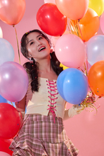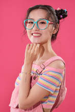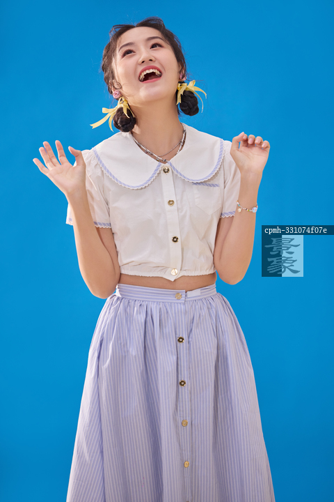 图片标题:     蓝色背景下的一位快乐的青年女人