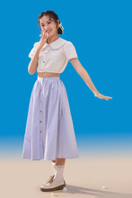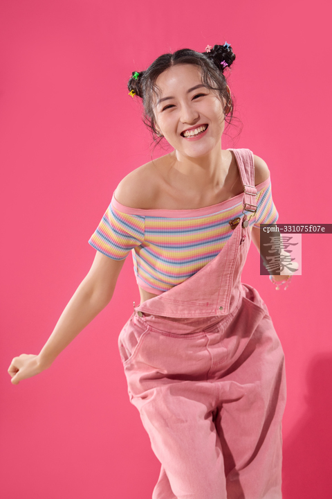 图片标题: 粉色背景下穿背带裤的快乐女孩