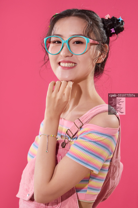 图片标题: 粉色背景下戴眼镜的快乐女孩