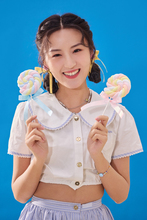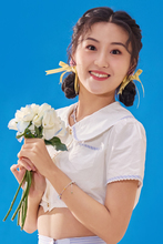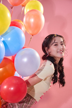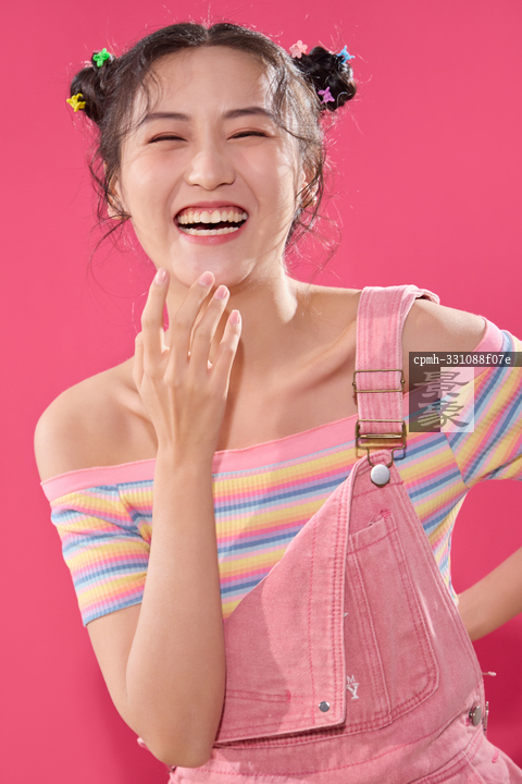 图片标题: 粉色背景下穿背带裤的快乐女孩