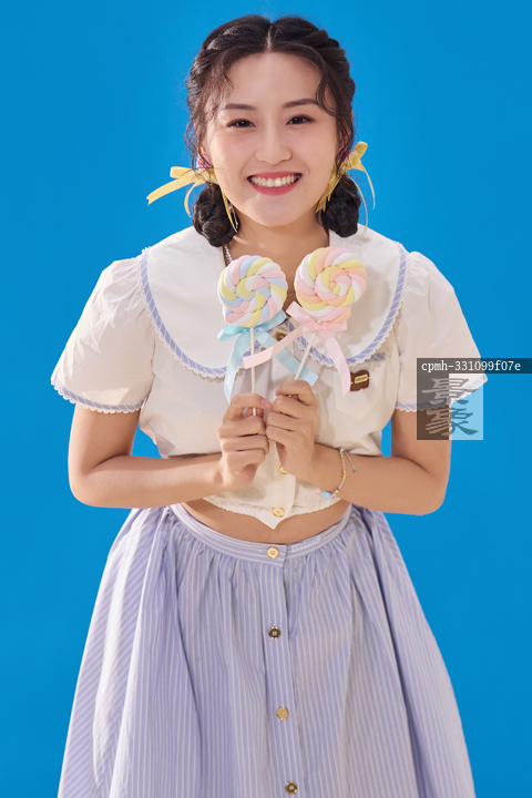 图片标题: 蓝色背景下的拿着棒棒糖的快乐女人