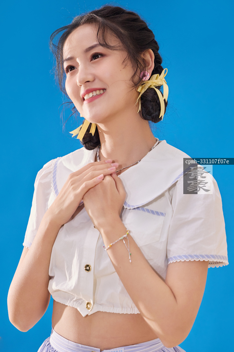 图片标题:     蓝色背景下的一位快乐的青年女人