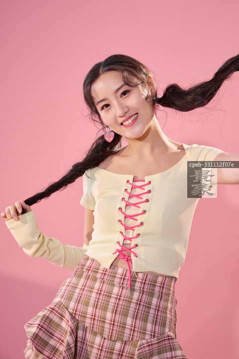 图片标题: 粉色背景下的一位年轻快乐女孩