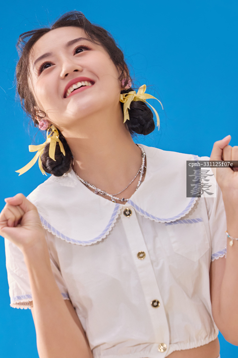 图片标题:     蓝色背景下的一位快乐的青年女人
