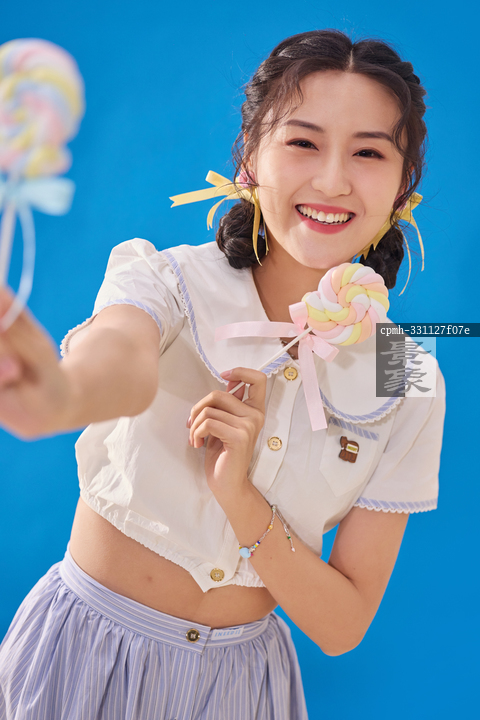 图片标题:     蓝色背景下的拿着棒棒糖的快乐女人