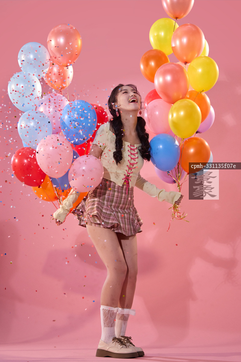 图片标题: 一位充满活力的年轻女孩拿着大量气球