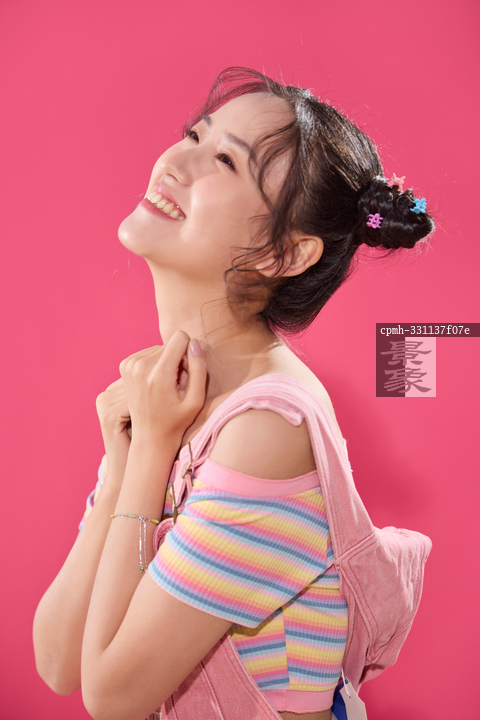 图片标题: 粉色背景下穿背带裤的快乐女孩