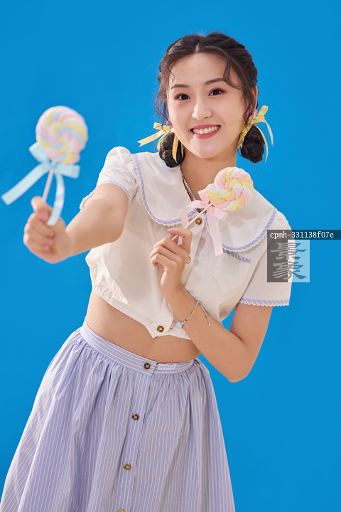 图片标题: 蓝色背景下的拿着棒棒糖的快乐女人