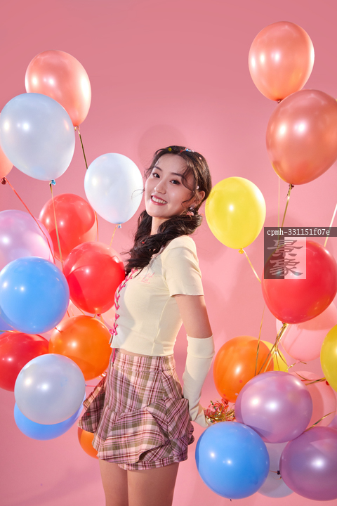 图片标题:     一位充满活力的年轻女孩拿着大量气球