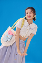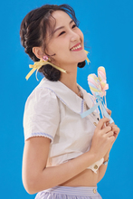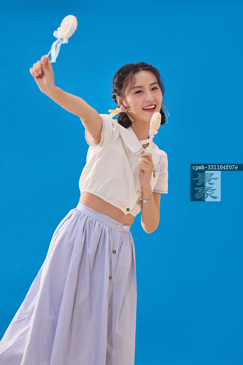 图片标题: 蓝色背景下的拿着棒棒糖的快乐女人
