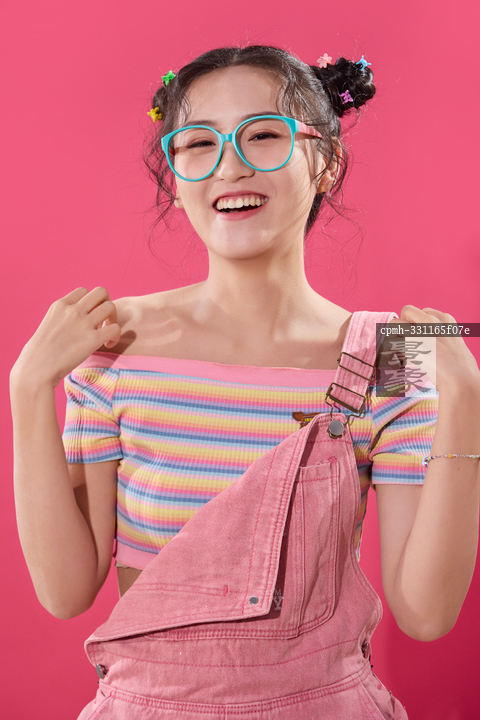 图片标题: 粉色背景下戴眼镜的快乐女孩